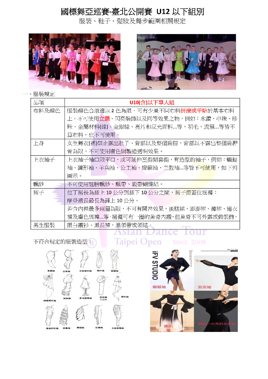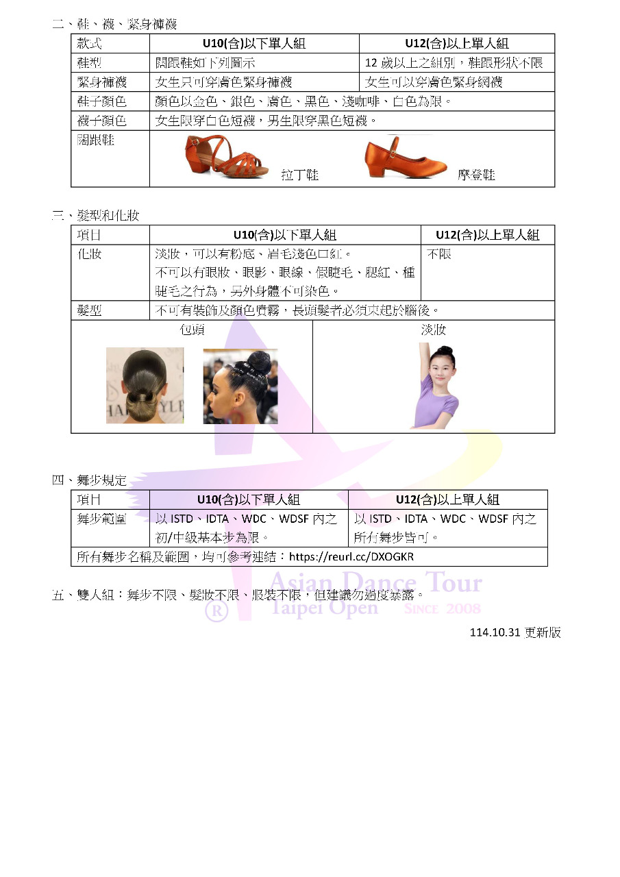 亞巡賽師生公開組計分及分齡計分說明;單人組服裝、妝髮及舞步規定 2025-10-31 00:00 2/28 亞巡賽師生公開組計分方式: 初賽:依照報名總對數於初賽進行分組,選取選手進入國際師生A組,其餘選手進入國際師生B組、C組.......等以此以此類推。A、B、C...組再各自進行決賽。簡單來說,每一對至少都會跳2次,每一對都有獎。 決賽:依照分組的各組別進行決賽,請留意被分到的組別。 2/27 亞巡賽師生分齡賽計分方式: 初賽:依照報名總對數依照學生之年齡排序後分組,分A、B、C...組再各自進行決賽。每一對都有獎。 單人組服裝&舞步規定: 舞步規定:https://reurl.cc/DXOGKR