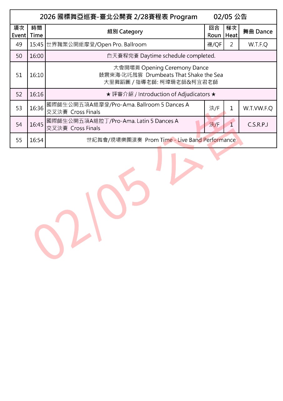 2026 國標舞亞巡賽-臺北公開賽 228賽程表公告 (0205更新)